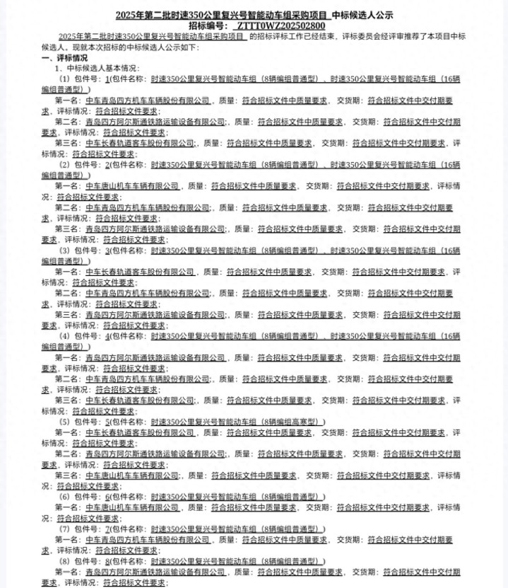 第二批时速350km复兴号智能动车组包含短编组108列,耐高寒型30列,16节长编组36列,由于数量多,为了方便各动车组制造商投标,分为了8个包件。
