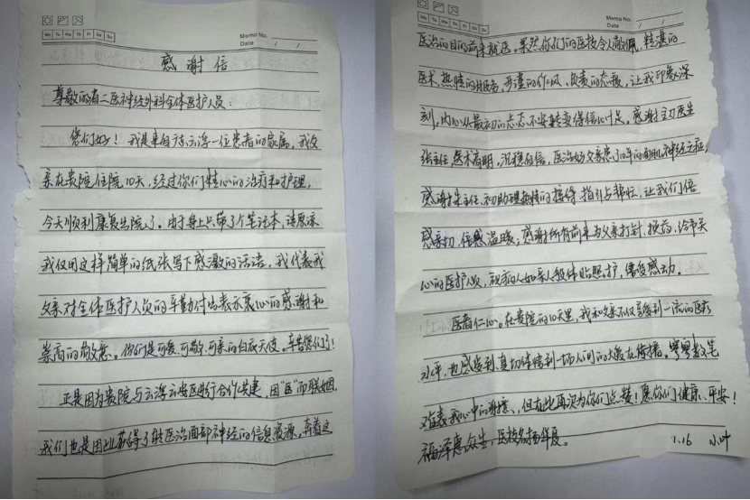 近日,广东省第二人民医院(以下简称“省二医”)神经医学中心功能神经病区收到了一封来自面肌痉挛患者的感谢信,信中写道:“感谢主刀医生,医术高明、沉稳自信,医治好父亲患了10年的面肌神经之症;感谢医护人员的热情接待、指引与帮忙,让我们倍感亲切与温暖;感谢所有为父亲打针、换药并给予关怀的医护人员,视病人如亲人般体贴照顾,让我们倍受感动。”
