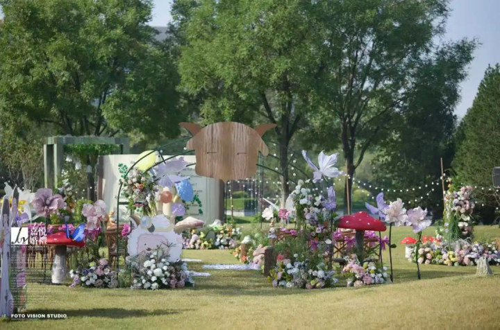 “羊村”的场地不大,在一个户外草坪做了一个羊村大门,门口摆放着懒羊羊的立牌,进场后有大型故事书、蘑菇等童趣布置,我还设计了一个蛋糕形状的摆台,堆满青草和鲜花,像是懒羊羊最爱吃的青草蛋糕,小羊们的玩偶、挂件等随处可见。我本来最担心的就是羊村的大门不能复刻,好在出来的效果还不错。我用这场婚礼,编织了一场属于自己的童话世界。